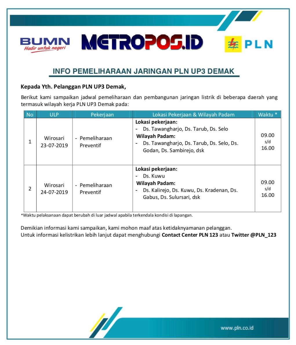 METROPOS.id, Grobogan – Kembali PLN UP3 Demak melakukan pemeliharaan jaringan listrik yang akan di lakukan pada hari Selasa hingga Rabu (23 – 24/7/2019). Hal ini di lakukan guna meningkatkan pelayanan dan mengamankan pasokan listrik kepada para pelanggan.