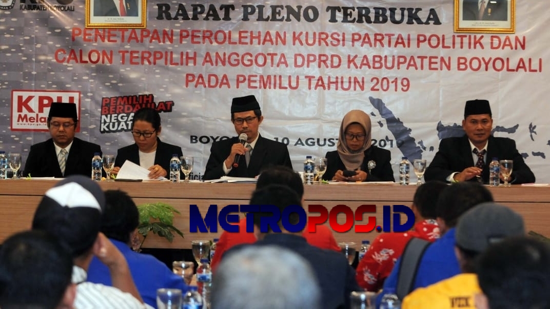 METROPOS.id, Boyolali –  Komisi Pemilihan Umum (KPU) Boyolali akhirnya menetapkan perolehan suara partai politik (Parpol) dan anggota Dewan Perwakilan Rakyat Daerah (DPRD) Boyolali pada Sabtu (10/8/2019) di Front One Hotel Boyolali.