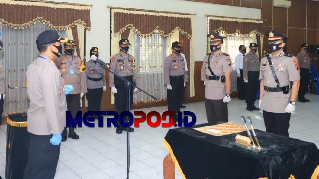 Upacara pergantian jabatan sebagai bentuk penyegaran organisasi di Polres Sukoharjo ini berlangsung menggunakan tata cara sesuai protokol kesehatan di aula Panjura Mapolres, Senin (15/6/2020).