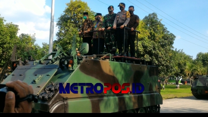 Dari tempat transit, Bupati dijemput menuju lokasi upacara pelepasan dilapangan Markas Brigif Mekanis 413/Bremoro, Palur, Mojolaban, Sukoharjo dengan naik kendaraan tempur panser ditemani unsur pimpinan lainnya, Sabtu (27/6/2020) sore.