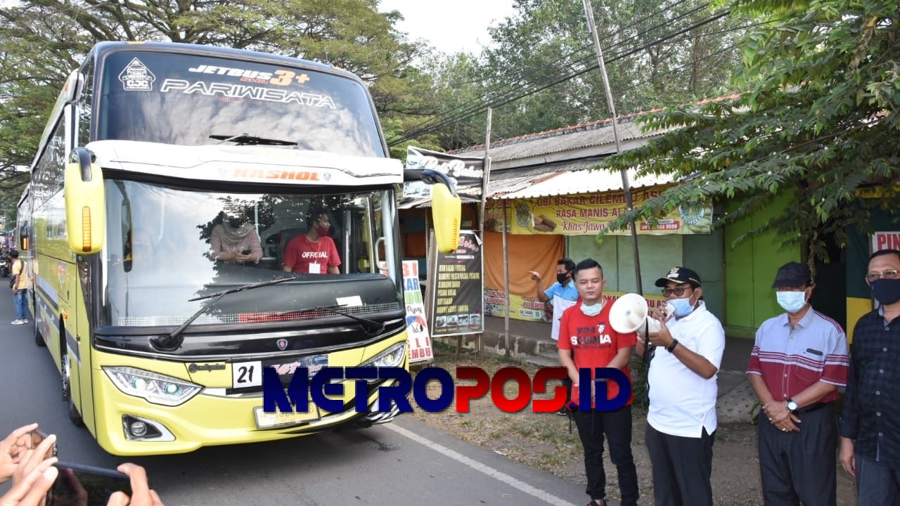 METROPOS.ID, KAB.PEKALONGAN – Bupati Pekalongan KH. Asip Kholbihi, SH.,M.Si melepas rombongan konvoi bus pariwisata di Jalan Raya Gemek, Kec. Kedungwuni, Minggu (12/7/2020) pagi.