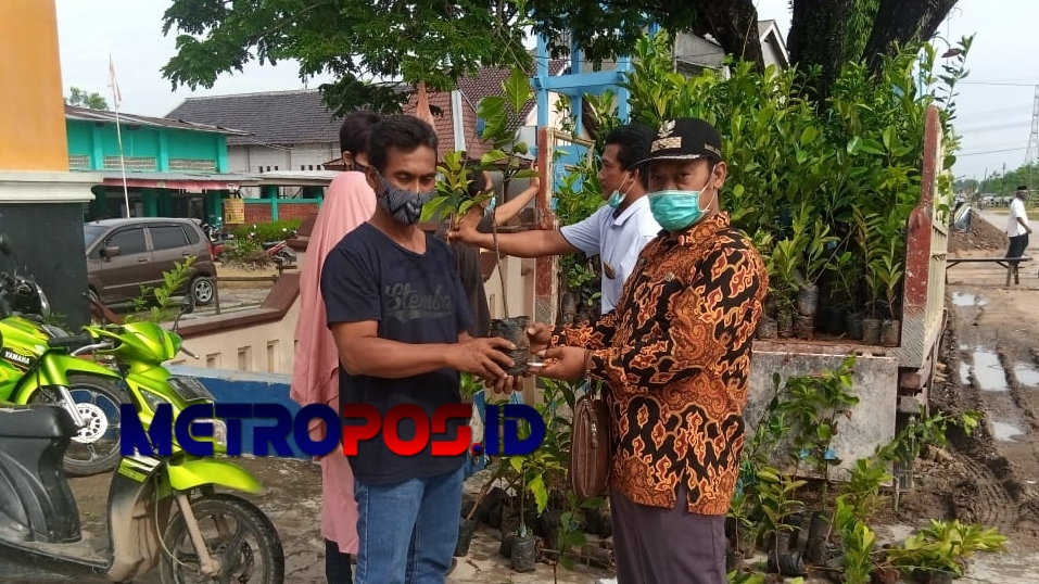 Kades Jeketro Ali Mustain saat memberikan bibit tanaman di depan kantor desa