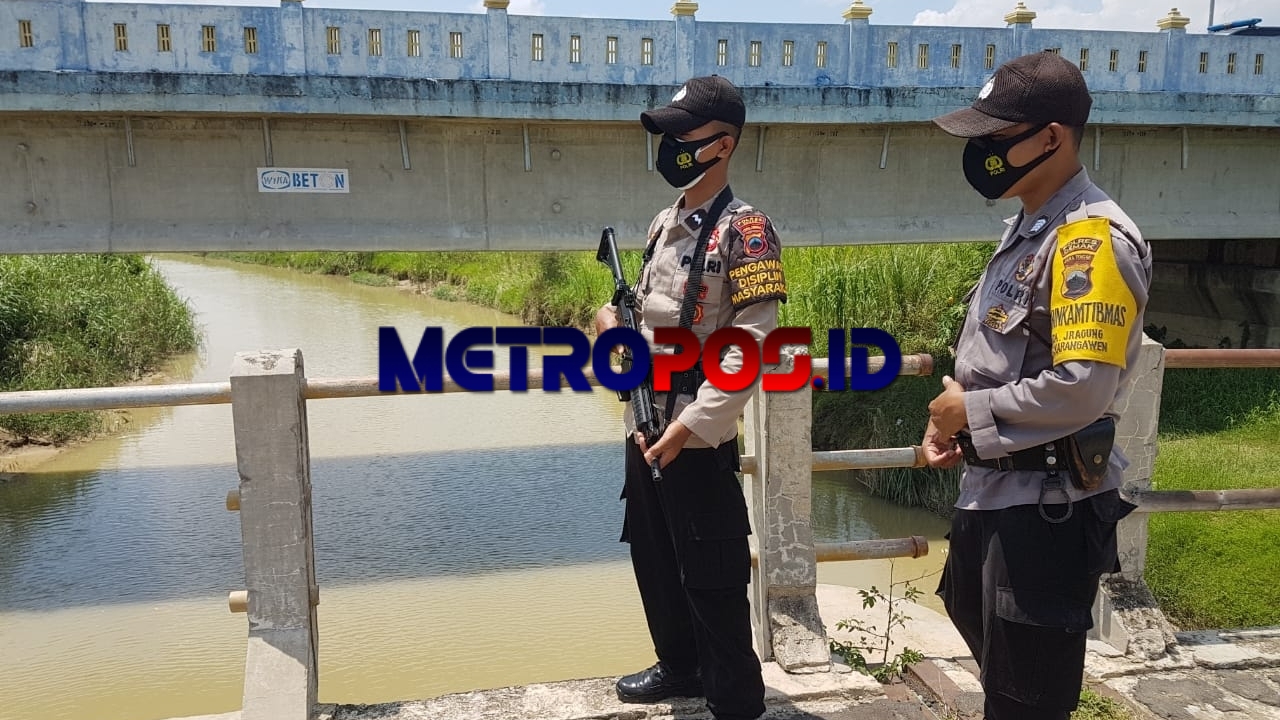 Anggota Polsek Karangawen saat memantau debit air sungai Cabean, Desa Sidorejo