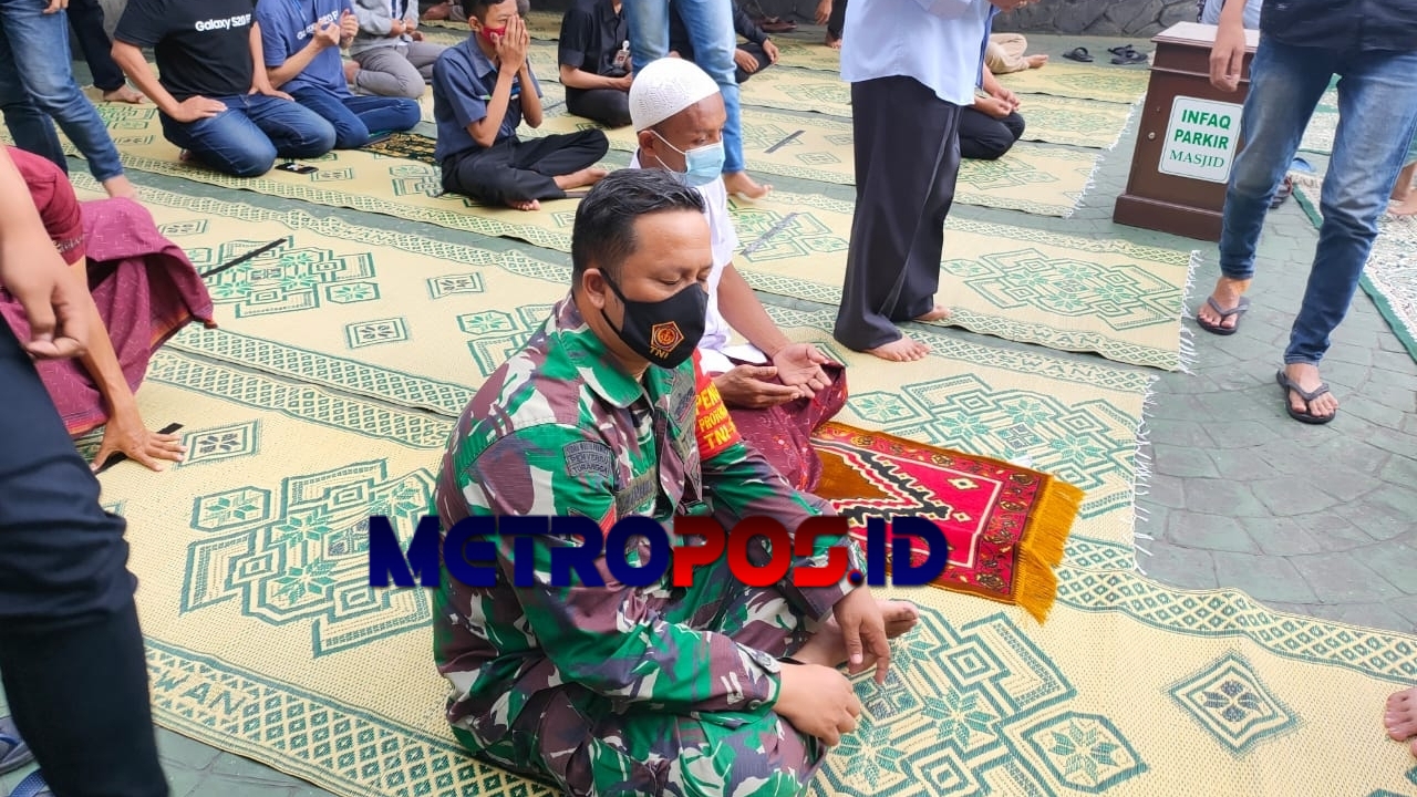 Babinsa Kemlayan saat terapkan Prokes yakni jaga jarak saat sholat Jum’at