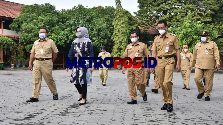 METROPOS.ID, SUKOHARJO – Bupati Sukoharjo Etik Suryani didampingi Wakil Bupati Agus Santosa dan Kepala Dinas Pendidikan dan Kebudayaan (Disdikbud) Sukoharjo, Darno memantau langsung hari pertama pelaksanaan uji coba Pembelajaran Tatap Muka (PTM) sekolah di SMP Negeri 1 Sukoharjo, Senin (5/4/2021).