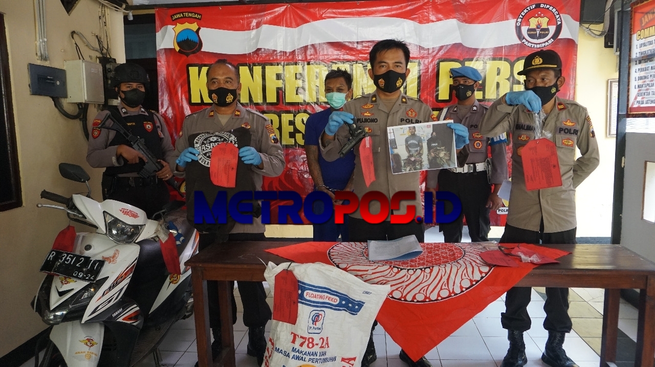 Dari tangan tersangka diamankan barang bukti berupa satu senjata jenis airsoft gun merk Baretta beserta sejumlah pelurunya, satu pisau karambit warna hitam, sejumlah tanaman hias jenis Aglonema, karung tempat menyimpan tanaman hasil curian, pakaian yang dipakai pelaku saat beraksi dan satu sepeda motor.