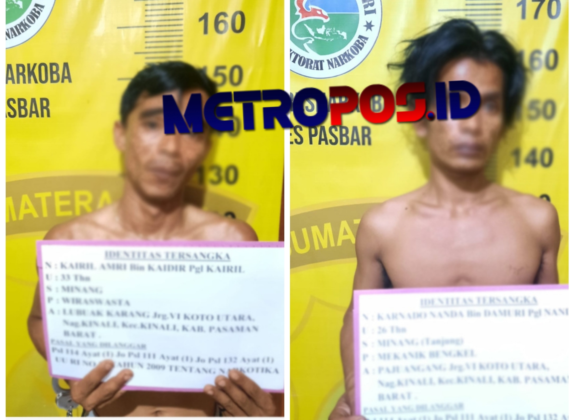 Metropos id, Pasbar – Karnando Nanda Saputra alias Nanda (26) warga Pajuanggang Jorong VI Koto Utara Nagari Kinali, Kec. Kinali, Kab. Pasabar (Pasaman Barat) dan Kairil Amri alias Kairil (33) warga Lubuk Karang Jorong VI Koto Utara Nagari Kinali, Kec. Kinali Kab. Pasbar terpaksa di amankan Polisi.Keduanya di tangkap Satresnarkoba Polres Pasbar diduga sebagai pelaku tindak pidana Narkotika jenis ganja kering.