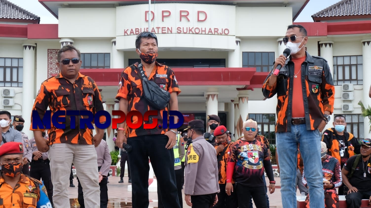 Dalam aksinya, massa anggota PP Kab. Sukoharjo melakukan orasi menyuarakan tuntutan di halaman kantor DPRD Sukoharjo, Jum’at (26/11/2021).
