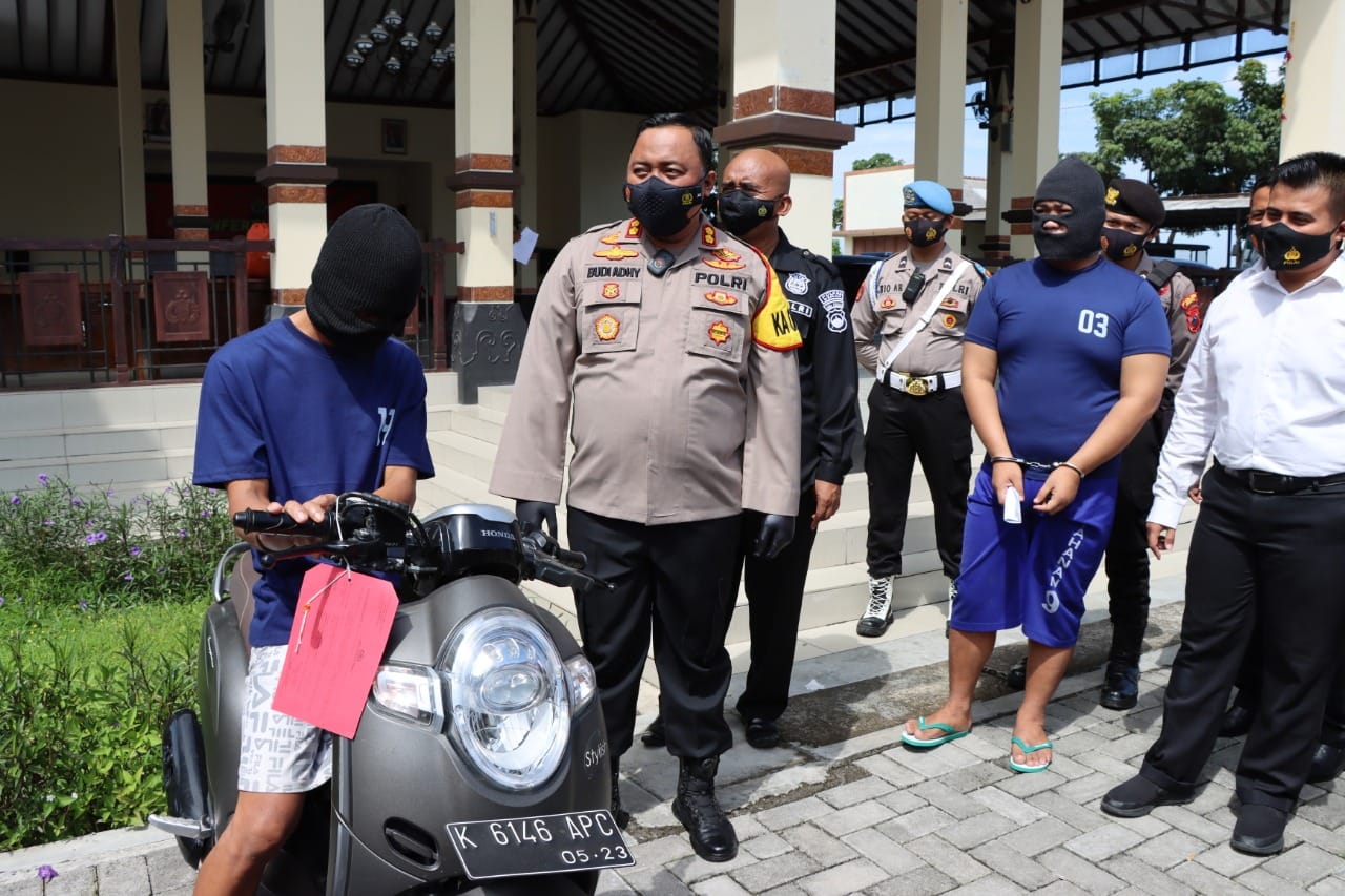 Selain kedua tersangka di amankan pula barang bukti berupa sepeda motor merek Honda jenis Scoopy milik korban dan sajam jenis bendo yang ditinggalkan pelaku di tempat kejadian.