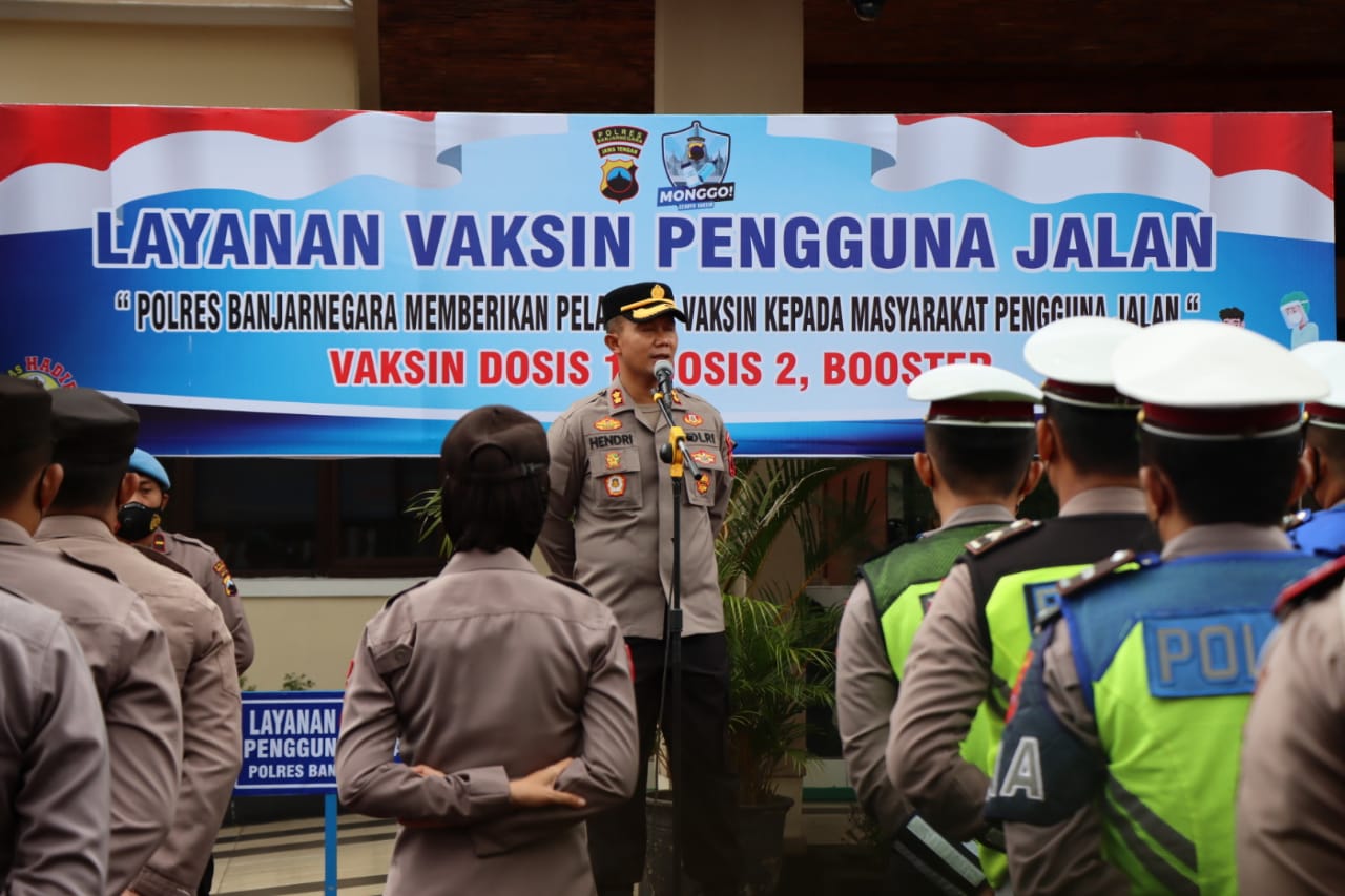 Kapolres Banjarnegara AKBP Hendri Yulianto saat memberikan arahan layanan vaksin pengguna jalan kepada anggotanya (Foto s@i)