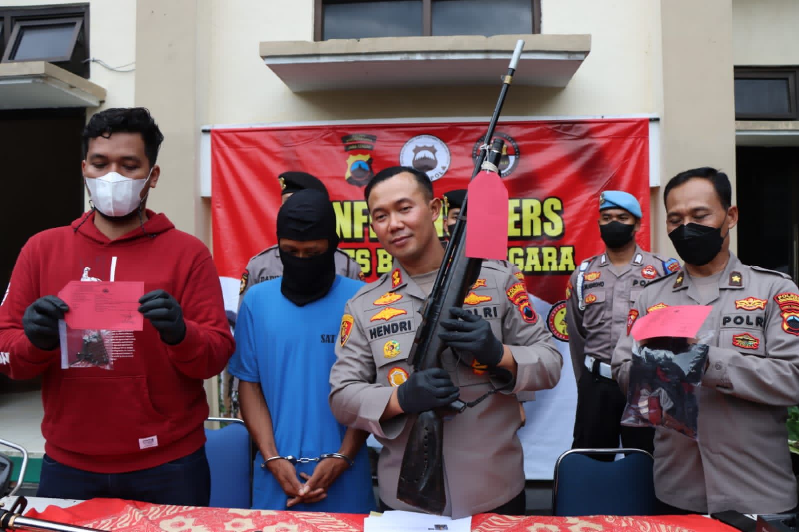 Kapolres Banjarnegara AKBP Hendri saat menunjukan barang bukti berupa senapan laras panjang (Foto Bidhmspolda jtg)