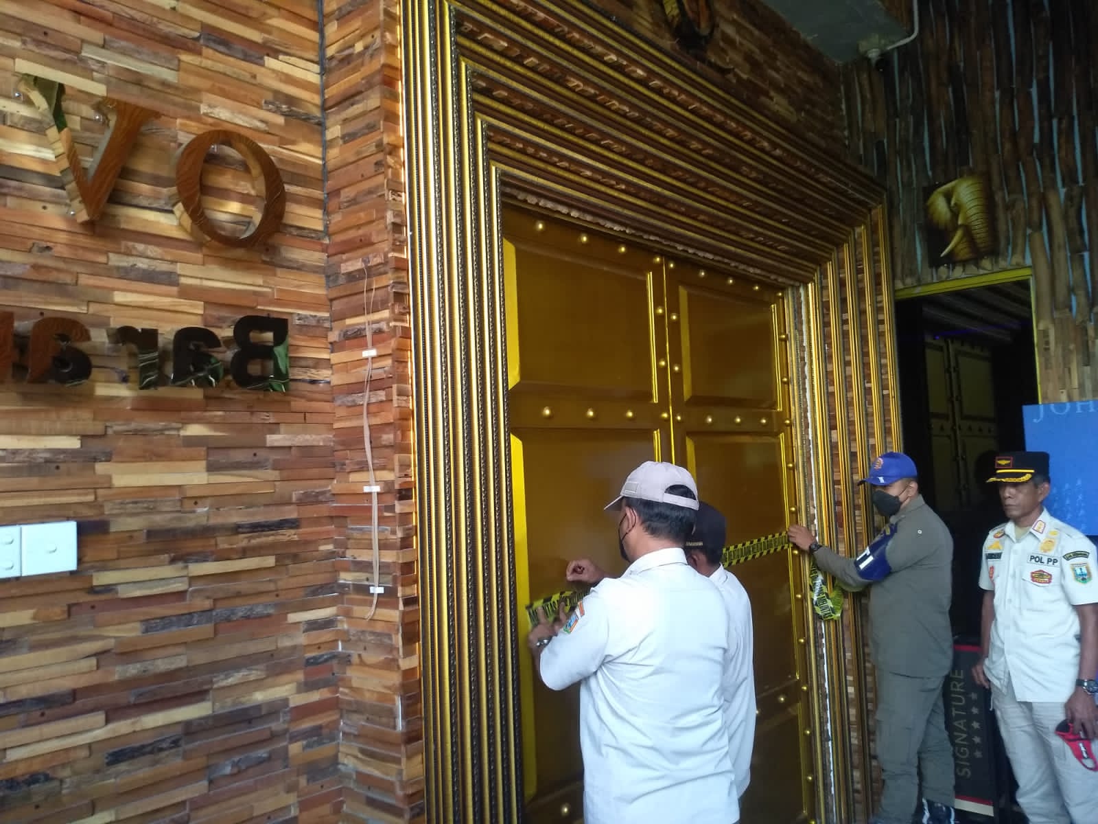 Tim menyegel pintu utama ruang atau Bar & Kitchen di Over_O. (Foto Heru Santoso)