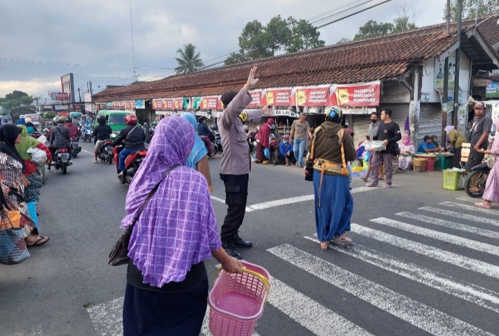 Tampak petugas dari Polsek Salaman sedang melakukan pengaturan lalu lintas, menyeberangkan warga yang melintas jalan keluar masuk pasar. (Miko/Red).