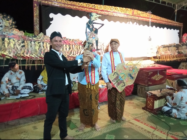 Riyadi, Kades Kadirejo simbolis menyerahkan wayang Petruk dan Gunungan kepada dalang menandai dimulainya gelaran wayang kulit lakon Petruk Nagih Janji. (Foto Wib)