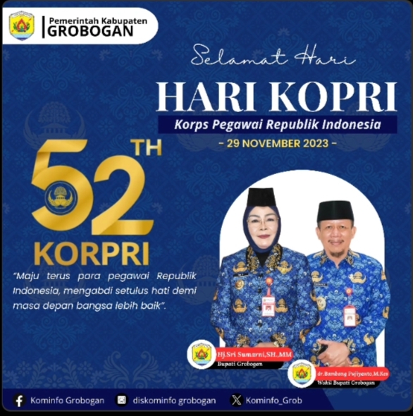 1 menit laluNovember 21, 2023oleh Redaksi Pemkab Grobogan Mengucapkan HUT KORPRI Ke 52 Tahun Redaksi-Grobogan, News-0 views Jangan LewatkanDiduga Kurang Waspada, Warga Grobogan Tewas Tertemper Kereta ApiPeringati 2 Dekade Pemilu Langsung, The Habibie Center Luncurkan Habibie Democracy ForumIni Pesan Bupati Grobogan Saat Pimpin Upacara Hari PahlawanMerawat Hati, Coach Addie Luncurkan Program Mata Hati
