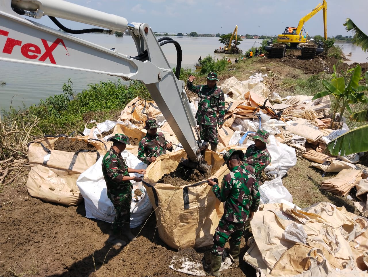 METROPOS.ID II Demak – Puluhan Prajurit Yonzipur 4/Tanpa Kawandya dengan sigap dan tanggap bangun ulang kembali tanggul jebol yang mengakibatkan banjir di wilayah Kab. Demak, Selasa (13/2/2024). Hal didasari rasa kemanusiaan untuk membantu masyarakat yang sedang terdampak banjir.