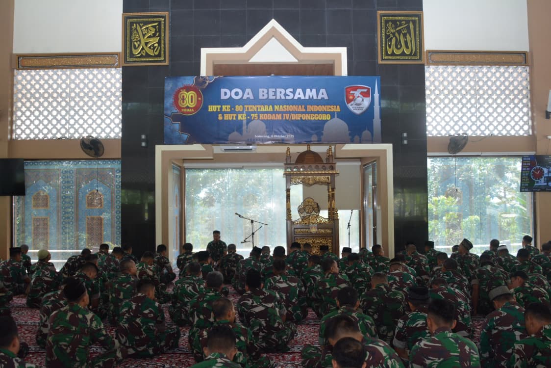 Doa bersama tersebut dipimpin langsung oleh Kasdam IV/Dip Brigjen TNI M. Andhy Kusuma, S.Sos., M.M., M.Han., CFrA., berlangsung dalam suasana yang khidmat. Para prajurit dan PNS bersimpuh memanjatkan syukur atas usia TNI yang telah menginjak 80 tahun, sekaligus memohon kekuatan serta perlindungan dalam menjalankan tugas menjaga keutuhan NKRI.