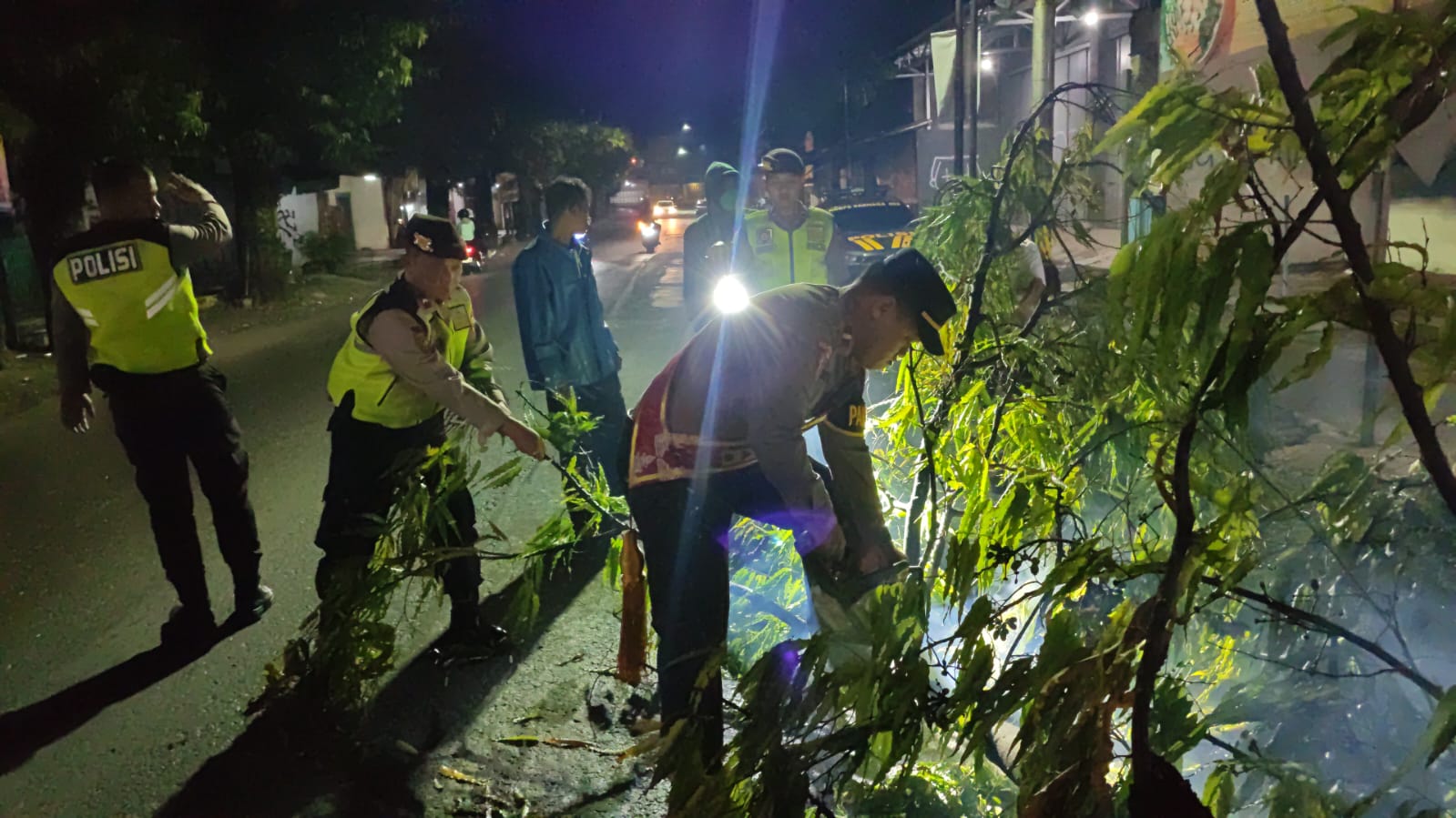 Foto : Pamapta Polres Tegal saat menangani kejadian pohon tumbang di Desa Kagok, Kec. Slawi, Kab. Tegal, Selasa (23/12/2025) malam.(ft.hms).