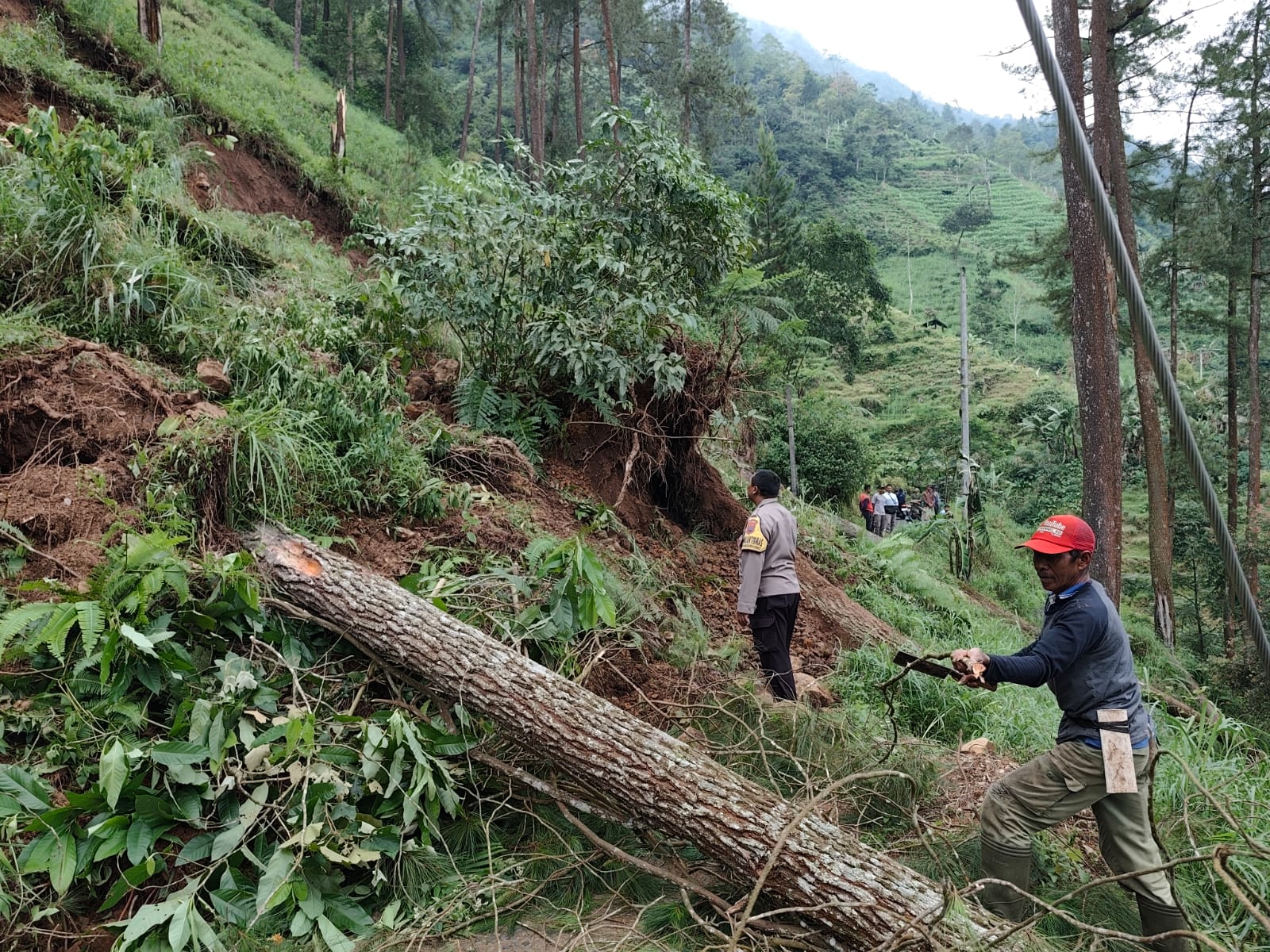 Longsor tersebut diketahui menyebabkan sebuah pohon pinus milik Perhutani roboh dan menghalangi akses jalan.