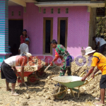 Personil Polsek Lebakbarang bersama warga setempat bergotong-royong membersihkan sisa-sisa tanah yang masih menumpuk di area rumah korban.